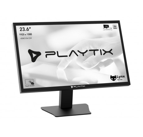 O monitor possui área visível e táctil de 23.6” no formato 16:9, com saída de som P2, conexão VGA, DVI e HDMI.