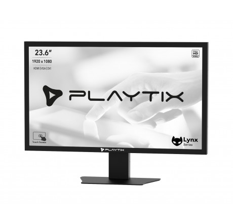 O monitor possui área visível e táctil de 23.6” no formato 16:9, com saída de som P2, conexão VGA, DVI e HDMI.