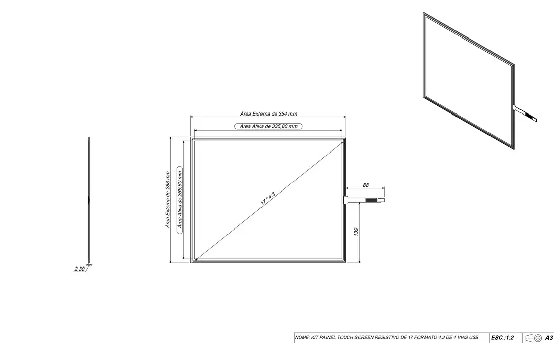 Espessura do componente touch: 2.30 mm de espessura.