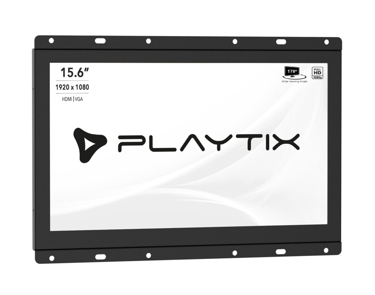 Monitor open frame 15.6 digital signage da linha Playtix, com tela Full HD IPS sem touch screen, fabricado no Brasil para sinalização digital profissional em varejo, corporativo e ambientes industriais. Monitor com fabricação nacional, garantia direta e assistência técnica especializada.