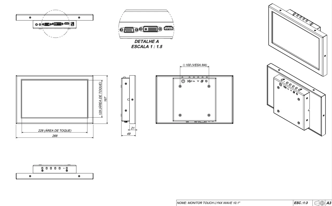 O monitor possui área visível e táctil de 10.1” no formato 16:9, com conexão VGA, DVI e HDMI.
