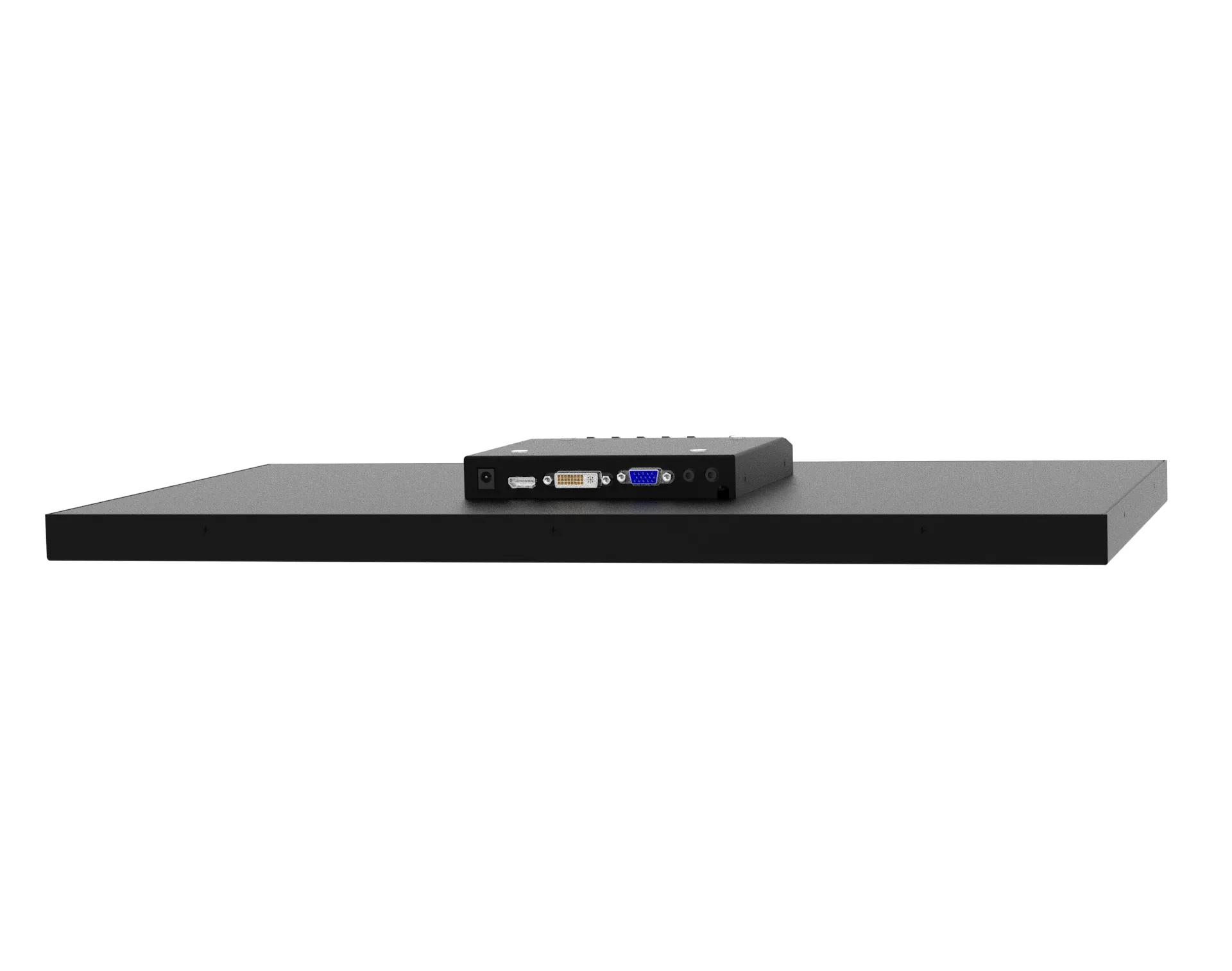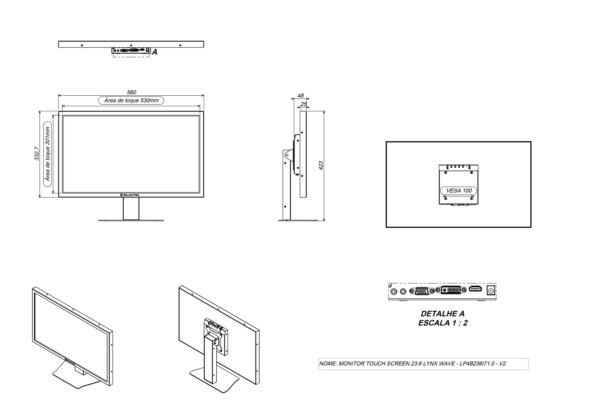 O monitor possui área visível e táctil de 23.6” no formato 16:9, com saída de som P2, conexão VGA, DVI e HDMI.