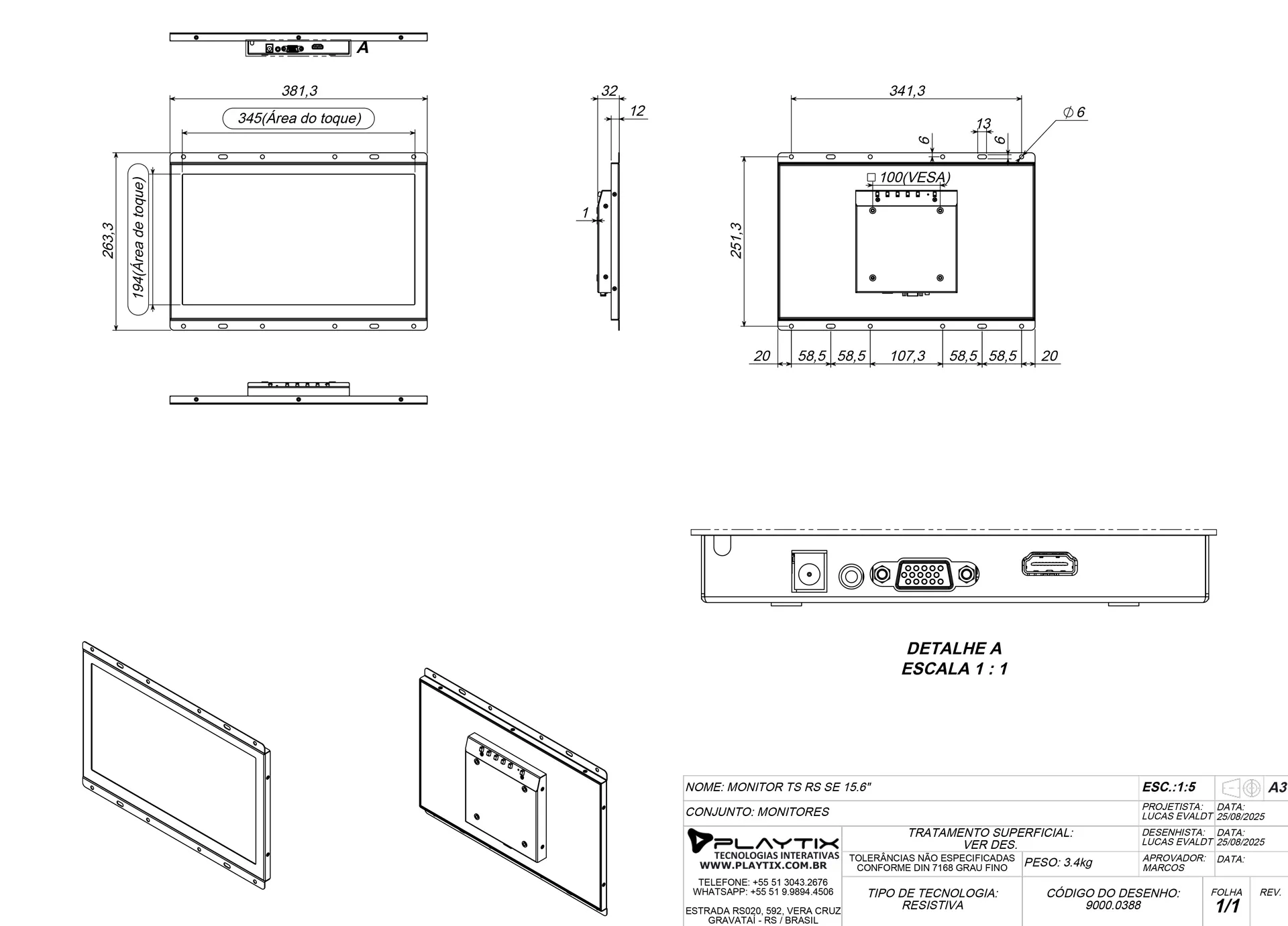 O Monitor Touch Screen Open Frame Resistivo de 15.6” Full HD IPS foi projetado com objetivo de proporcionar rapidez, agilidade, qualidade e segurança durante sua instalação. Possui abas frontais que incluem oblongos e furações pré dispostos para instalação ágil e segura (ou pela furação VESA em sua parte traseira). Suas principais aplicações são automações Industriais, Comerciais e residenciais, por exemplo, sendo componente para a fabricação de totens, ATM, foto cabines, painéis de consulta, terminal de retirada de senhas entre outros. Devida sua robustez é uma excelente escolha para aplicações em ambientes insalubres, tais como cozinhas e áreas de produção industrial.