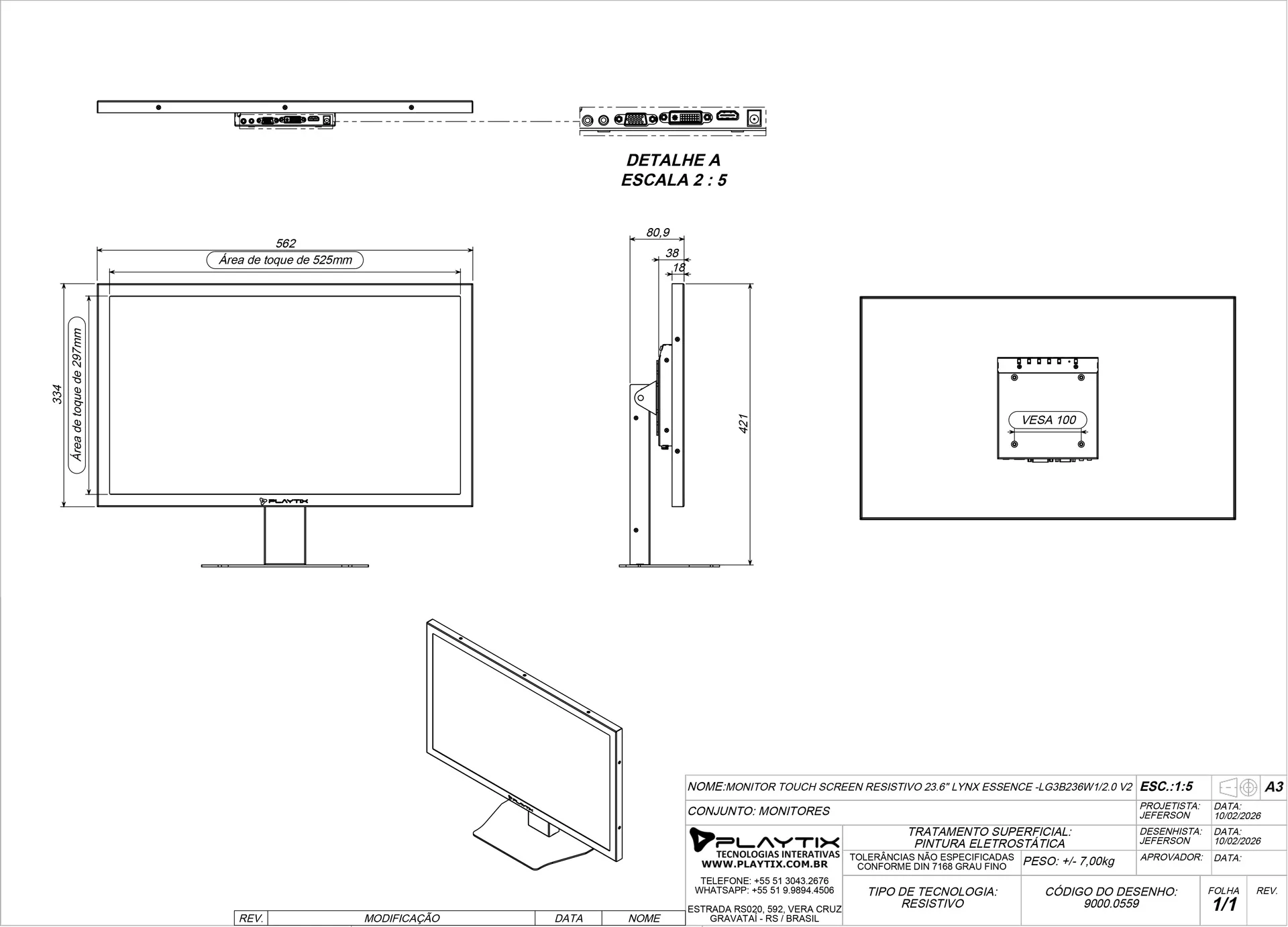 O monitor possui área visível e táctil de 23.6” no formato 16:9, com conexão VGA, DVI e HDMI. Resolução Full HD 1920 x 1080 pixels na tecnologia TFT-LCD. Sua alimentação é através de fonte externa bivolt. Equipado com touch resistivo de 23.6” conectado via USB.