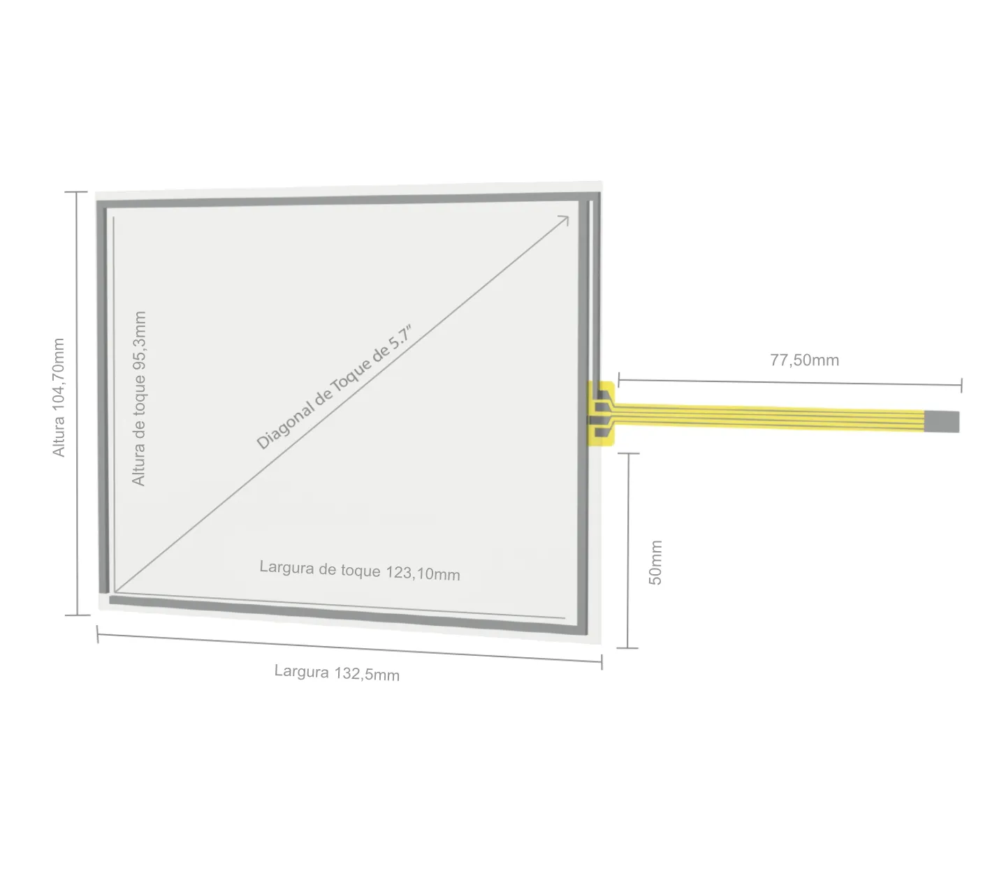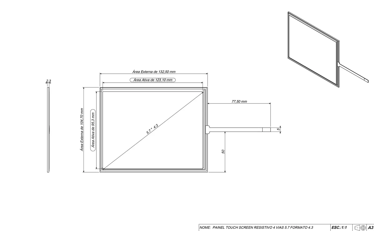 O produto anunciado consiste somente da Tela sensível ao toque Resistiva de 5.7″ e vidro incolor 5.7″ 4:3 (132,50 x 104,70 x 2,30mm) sem a controladora USB (somente para substituição).